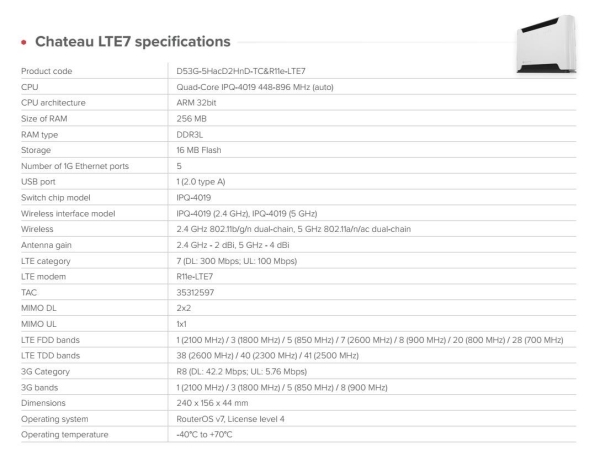 Univerzální domácí router s novým modemem CAT7 a rychlým čtyřjádrovým procesorem pro všechny úkoly související s bezpečností a správou domácí sítě. Dvoupásmové Wi-Fi s duálním řetězcem, 5 gigabitových portů a plná výbava operačního systému RouterOS v7 Ideální pro bezpečné připojení VPN, domácí kanceláře nebo sítě malých podniků, které kladou důraz na funkčnost i estetiku. Skvělý prvek jak v rukou zkušených správců systémů, tak v domácnosti pro uživatele bez jakýchkoli IT znalostí. Proč upgradovat na CAT7? • Dvojnásobná rychlost uploadu • Rozšířená podpora frekvencí – nyní zahrnuje pásmo 32 (1500 MHz) pro ještě lepší výkon v přetížených oblastech. • Stejný osvědčený design – žádné změny v instalaci nebo konfiguraci. • Nižší náklady – lepší konektivita, která ve skutečnosti stojí méně. Všechna nová zařízení CAT7 také podporují 2×2 MIMO DL a agregaci pásem. To znamená, že mohou současně využívat více pásem LTE. To je obrovská výhoda, když je v dané oblasti mnoho mobilních uživatelů. Nabízí lepší odezvu v přeplněném prostředí, vyšší účinnost v situacích se slabším signálem. Po zapnutí agregace pásem jsme zaznamenali zdvojnásobení rychlosti internetu ve venkovských oblastech. Chateau LTE7 je vysokorychlostní dvoupásmový domácí přístupový bod, který se přizpůsobí vašim potřebám Chateau je navržen tak, aby sloužil nejrůznějším skupinám uživatelů: od profesionálů v oblasti IT, kteří jej mohou využít až na hranici svých možností, po běžné domácnosti. K připojení všech domácích zařízení (mediálních serverů) je připraven 5x gigabitový ethernetový port (PC věže, televizory). Můžete si také ponechat LTE jako zálohu a použít gigabitový Ethernet k připojení k poskytovateli internetu pro ještě vyšší rychlosti. Konec úzkých hrdel v podobě nízkokapacitních domácích routerů Mnoho domácností je omezeno levnými routery bez LTE funkcí, které jednoduše nezvládají nároky moderního využívání internetu. Řešením je Chateau. Svobodně kdekoliv s LTE Dosáhněte konzistentní rychlosti až 300 Mb/s díky agregaci nosných sítí, protože CAT6 umožňuje zařízením využívat více pásem současně. Chateau LTE6 poskytuje lepší odezvu v přeplněném prostředí a vyšší účinnost v situacích se slabším signálem mimo městské aglomerace. Vlastnosti Chateau je vybaven všemi pokročilými funkcemi RouterOS, takže získáte řešení podnikové úrovně za cenu spotřebitelské třídy. • využívejte zabezpečenou síť VPN z kanceláře přímo k vám domů • povolte nejrůznější druhy rodičovské kontroly • ponořte se do specifických pravidel brány firewall a hardwarové akcelerace IPsec • nakonfigurujte sítě VLAN, nastavte e-mailová nebo SMS upozornění • můžete automatizovat složitá spouštěcí oznámení (např: "VAROVÁNÍ!" pokud šířka pásma dosáhla hodnoty X po dobu trvání Y!) Podpora nasazení mobilními operátory Chateau podporuje technologii TR-069, která umožňuje vytvářet vlastní možnosti vzdálené správy klientů. Nejjednodušší a nejzákladnější nastavení routeru můžete mít na stejné webové stránce, kterou používáte k placení mobilního účtu. Technické specifikace: Product code: D53G-5HacD2HnD-TC&R11e-LTE7 CPU: Quad-Core IPQ-4019 448-896 MHz (auto) CPU: architecture ARM 32bit Size of RAM: 256 MB RAM type: DDR3L Storage: 16 MB Flash Number of 1G Ethernet ports: 5 USB port: 1 (2.0 type A) Switch chip model: IPQ-4019 Wireless interface model: IPQ-4019 (2.4 GHz), IPQ-4019 (5 GHz) Wireless: 2.4 GHz 802.11b/g/n dual-chain, 5 GHz 802.11a/n/ac dual-chain Antenna gain: 2.4 GHz - 2 dBi, 5 GHz - 4 dBi LTE category: 7 (DL: 300 Mbps; UL: 100 Mbps) LTE modem: R11e-LTE7 TAC: 35312597 MIMO DL: 2x2 MIMO UL: 1x1 LTE FDD bands: 1 (2100 MHz) / 3 (1800 MHz) / 5 (850 MHz) / 7 (2600 MHz) / 8 (900 MHz) / 20 (800 MHz) / 28 (700 MHz) LTE TDD bands: 38 (2600 MHz) / 40 (2300 MHz) / 41 (2500 MHz) 3G Category: R8 (DL: 42.2 Mbps; UL: 5.76 Mbps) 3G bands: 1 (2100 MHz) / 3 (1800 MHz) / 5 (850 MHz) / 8 (900 MHz) Dimensions: 240 x 156 x 44 mm Operating system: RouterOS v7, License level 4 Operating temperature: -40°C to +70°C Napájení: Number of DC inputs: 1 DC jack input Voltage: 12-28 V Power adapter nominal voltage: 24 V Power adapter nominal current: 1.2 A Max power consumption without attachments: 16 W Max power consumption: 21 W Upozornění Výrobce Mikrotik neposkytuje záruku na zařízení poškozená přepětím. Zařízení je třeba adekvátně chránit proti indukovanému elektrostatickému přepětí či přepěťovým špičkám na silovém vedení. Pro venkovní instalace používat výhradně stíněnou kabeláž (FTP/SFTP), jednotky korektně uzemnit (užití integrovaného zemnícího členu, ethernetové přepěťové ochrany). Zařízení vždy provozujte s poslední výrobcem publikovanou verzí (výrobcem označenou "Stable") operačního systému RouterOS. Taková verze garantuje nejoptimálnější funčknost, obsahuje opravené chyby z verzí předchozích a výkonová vylepšení.