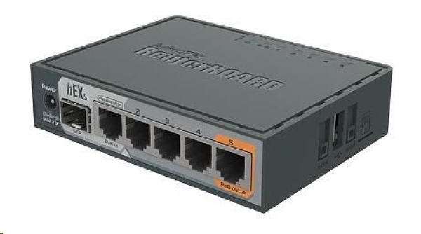 RB760iGS neboli hEX S je 5-portový Gigabitový router pro místa, kde není zapotřebí bezdrátové připojení. Ve srovnání s obyčejným hEX modelem má model hEX S také port SFP a výstupní PoE-Out na portu č.5.