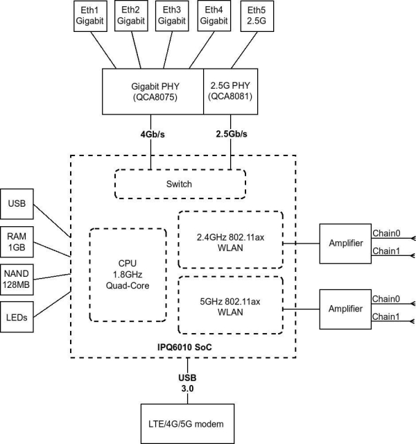 Chateau LTE18 ax je Dual Band 2.4/5GHz Wi-Fi 6 router do domácnosti či malých firem s (4) Gigabit LAN + (1) 2.5-Gigabit porty, LTE18 modemem, jedním USB portem, L4 licencí a extra rychlým 4-jádrovým ARM CPU s taktem 1800 MHz, vnitřním uložištěm 128 MB a 1 GB RAM. Uživatel tak může souběžně používat 2.4GHz kanál pro asociovaná mobilní bezdrátová zařízení a 5GHz kanál mít vyhrazen např. pro TV streamování videa. Modulační rychlost 2.4GHz rádiové části (2x2 MIMO) je 574 Mbps a pro 5GHz (2x2 MIMO) je to 1200 Mbps. Chateau LTE18 ax disponuje čtyřmi vestavěnými anténami pro LTE, dvěmi SMA female konektory pro případný vylepšení LTE dosahu pomocí externích antén a dvěmi anténami pro Wi-Fi, které jsou součástí balení.