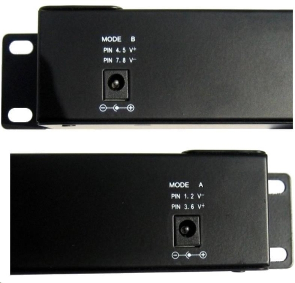 Vstup pro napájení prostřednictvím dvou 2.1mm 60V jacků, z obou vstupů je vždy zároveň napájeno všech 12 portů v režimu dle zvoleného A/B vstupu: