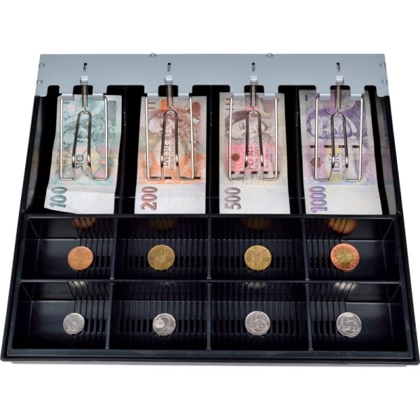 - Přihrádky: 4×, pro bankovky, 8×, pro mince - vyjímatelný mincovník
