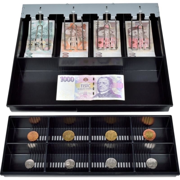 - Vyjímatelný mincovník a pořadač bankovek s libovolně nastavitelnými přihrádkami