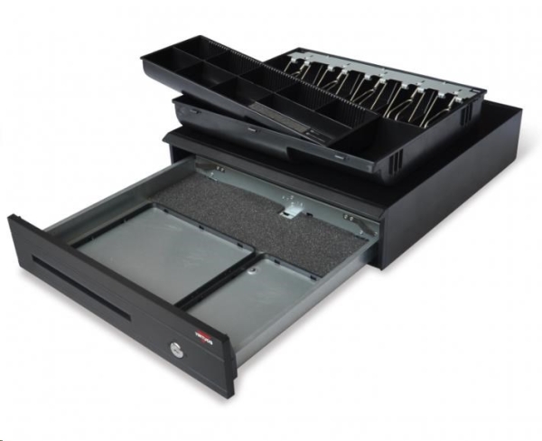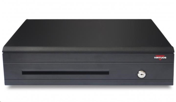 Vlajková loď pokladních zásuvek Virtuos® Tato pokladní zásuvka Virtuos C425 je nepostradatelným vybavením každého obchodu. Všichni prodejci tak ocení praktičnost, ale i pevnou konstrukci této pokladny. Základní parametry *Dostatečně široký pořadač robustní plastové konstrukce pro pohodlné umístění 5 druhů bankovek vedle sebe *Vyjímatelný mincovník a pořadač bankovek s libovolně nastavitelnými přihrádkami *Přidržování bankovek výměnnými přítlačnými kovovými držáky s pružinou *Lepší manipulace s bankovkami - houbička pro navlhčení prstů v přední části zásuvky *Pořadač bankovek je možné opatřit uzamykatelným krytem *Otvírání zásuvky: mechanicky klíčkem nebo elektronicky *Elektronická kontrola otevření zásuvky pomocí tzv. microswitche *Možnost vkládání bankovek a šeků přední štěrbinou bez otevření zásuvky *Mechanicky odolná konstrukce *Připojovací konektor RJ50 10P10C umožňující připojení ke všem systémům na 9-24V *Připojovací konektor umístěn ve dně zásuvky - není omezen prostor za zásuvkou *Součástí kabel RJ12 24V pro připojení k pokladní tiskárně (EKA0518) Specifikace *Nastavitelné přihrádky: 5× pro bankovky - vyjímatelný pořadač, 8× pro mince - vyjímatelný mincovník *Elektronika ovládání: Solenoid 9-24V/max. 1A *Rozměry zásuvky: 425 (Š) × 100* (V) × 455 (H) mm (*měřeno bez gumových nožiček vysokých 10 mm) *Hmotnost: 8,6 kg (bez obalu), 9,4 kg (s obalem) *Konektor: RJ-50 10P10C pro připojení externího kabelu *Rozhraní: Způsob připojení k systému je dán výběrem externího kabelu. Součástí dodávky je kabel RJ12 24V pro připojení k pokladní tiskárně (EKA0518).