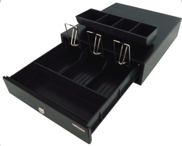 Pokladní zásuvka mikro EK-300C RJ10P10C, s kabelem, 9-24V, pořadač 3/4, černá Základní parametry * Kompaktní, pouze 30 cm široká pokladní zásuvka * Integrovaný pořadač bankovek robustní plastové konstrukce s pevnou velikostí přepážek * Kovové držáky bankovek * Vyjímatelný mincovník * Otvírání zásuvky: mechanicky klíčkem nebo elektronicky * Elektronická kontrola otevření zásuvky (tzv. microswitch) * Mechanicky odolná konstrukce * Univerzální připojení libovolných pokladních systémů pomocí konektoru RJ50-10p10c výběrem příslušného externího kabelu * Součástí kabel RJ12 24V pro připojení k pokladní tiskárně (EKA0518) * K dispozici další příslušenství - náhradní mincovník, zámek, držák bankovek + pružina, elektromagnet, nylonové ložisko Specifikace * Přihrádky: 3x pro bankovky, 4x pro mince * Materiálové provedení: Zásuvka ocelový plech, pořadač odolný plast * Zámek: 3 polohy (zamčeno, el. otevírání, otevřeno) * Připojovací konektor: RJ-50 10P10C pro připojení externího kabelu * Kontrola uzavření: Interní mikroswitch (otevřeno=rozpojeno) * Doporučená délka pulsu: 100 až 250 ms * Elektrické parametry: Napětí 12V/24V, proud max. 1A +-10% * Otvírání: Ručně klíčem, elektronicky s možným ručním otevřením * Rozměry zásuvky: 300 (Š) × 80 (V) × 360 (H) mm