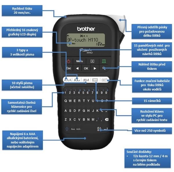 Kompaktní ruční tiskárna štítků Brother PT-H110 je ideální pomocník pro kanceláře, sklady i domácí použití. Umožňuje rychlý a přehledný tisk popisků na pásky o šířce 6, 9 nebo 12 mm. Nabízí náhled před tiskem, automatické číslování i zrcadlový tisk. Díky přehlednému grafickému displeji a QWERTY klávesnici je ovládání jednoduché a intuitivní.