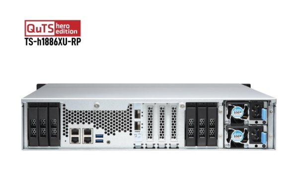 Zařízení TS-h1886XU-RP R2 2U s montáží do racku má dvanáct 3,5" diskových pozic SATA 6Gb/s, šest 2,5" slotů SATA 6Gb/s SSD, podporuje konektivitu 10GbE a čtyř 2,5GbE a je vybaveno čtyřjádrovým procesorem Intel Xeon D-1622 s pamětí až 128 GB DDR4 ECC (Error Correcting Code). S operačním systémem QuTS hero na bázi ZFS dosahuje TS-h1886XU-RP R2 výkonu serverové třídy a vysoké spolehlivosti. Ať už jde o souborové servery s kritickým významem, virtualizační servery, kolaborativní úpravy videí nebo efektivní aplikace pro zálohování a obnovu dat, zařízení TS-h1886XU-RP R2 s tříletou zárukou nabízí vysoce výkonné a zároveň cenově výhodné řešení NAS.