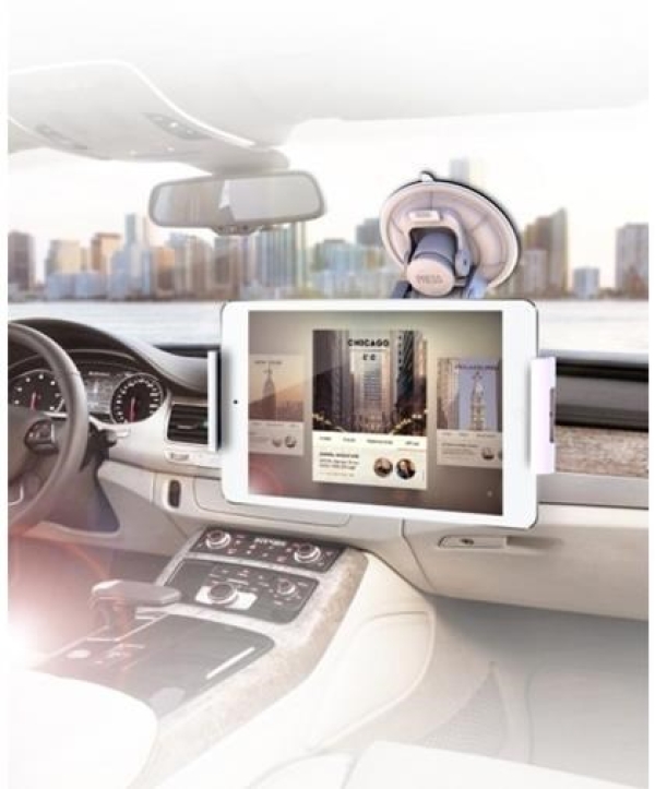Držák pro tablety 7-11" v horizontální i vertikální poloze do auta na přední sklo. Přísavný adapter na sklo s kulovou hlavou pro volné nastavení, otočný o 360°, fixace ze dvou stran, plastové provedení, bílý.