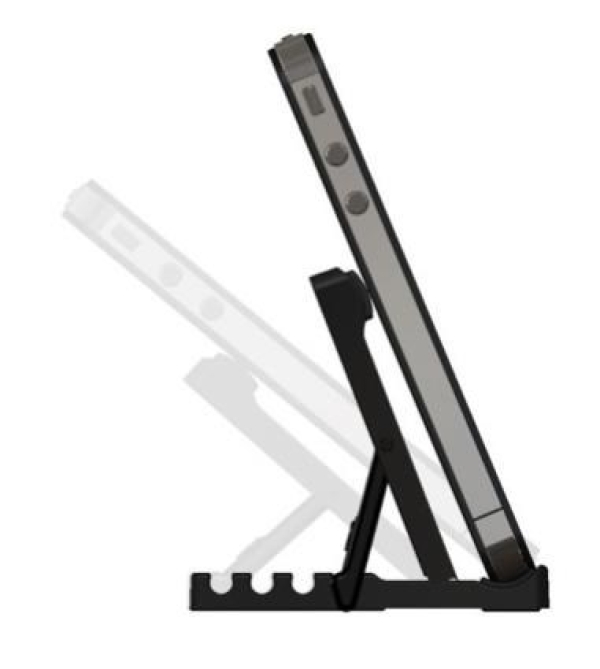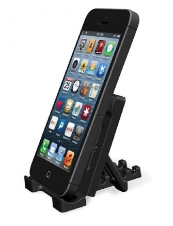 Stojánek pro chytré dotykové telefony v horizontální i vertikální poloze na stůl. Možnost nastavení 5 úhlů, skládací mechanizmus pro snadný transport, opření telefonu na spodní hraně, plastové provedení, černý.