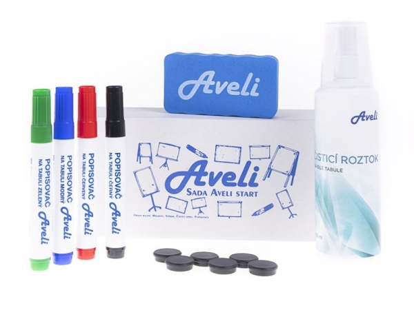 Základní sada pomůcek k popisovacím tabulím. Sada obsahuje: 4 barevné popisovače na bílé tabule, čistící 250 ml sprej, 6 černých kulatých magnetů o průměru 24mm, 1 magnetická stěrka - 4 popisovače (černý, červený, modrý, zelený) - Stěrka na tabuli - Tekutý čistič ve spreji s rozprašovačem (250ml) - Sada 6 kusů černých magnetů