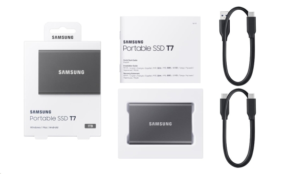 Přenosný disk Samsung SSD T7 dosahuje vyšší rychlosti a tím i nové úrovně přenosu a externího ukládání dat. Díky kompaktnímu, odolnému designu a zabezpečení pomocí hesla je ideální pro přenášení a vysoké zabezpečení uchovávaných dat. *Externí SSD disk nové generace - lehký, rychlý a spolehlivý Kapacita: 1TB Rozhraní: USB 3.2 Gen.2 (10Gbps) Rozměry: 85 x 57 x 8,0 mm Váha: 58 g Přenosová rychlost: Až 1050 MB/s (* Výkon se může lišit v závislosti na konfiguraci hostitele a testovacím softwaru.) Režim UASP: Support Šifrování: 256bitové AES hardwarové šifrování Zabezpečení: Samsumg Portable SSD Software 1.0 Certifikace: CE, BSMI, KC, VCCI, C-tick, FCC, IC, UL, TUV, CB, EAC Barva: Stříbrná Záruka: Omezená tříletá
