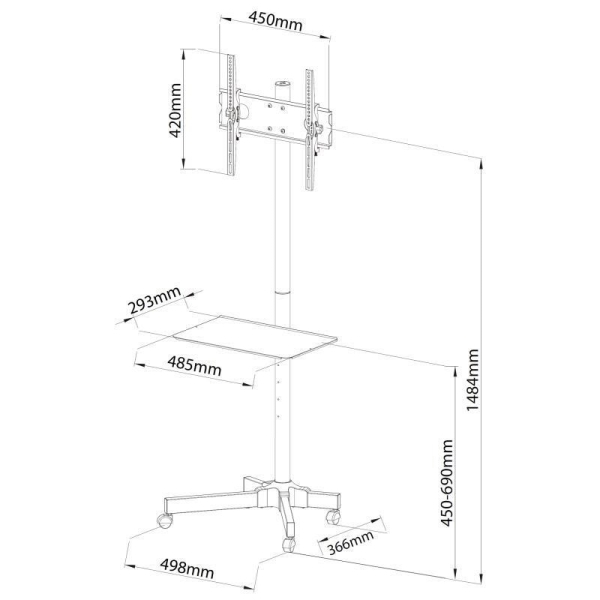 Stojan na televize i monitory 23-55", VESA 75x75 až 400x400, nastavení výšky Tv 1000-1480mm, náklonu Tv +15°/-15°, systém pro skryté vedení kabeláže, kolečka s aretací, polička na příslušenství 485x293mm, nosnost 25kg