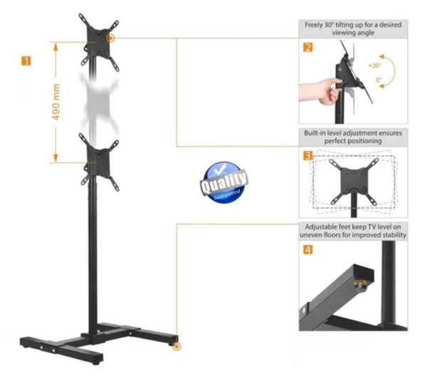 Kvalitní a elegantní podlahový stojan na televizi, monitor nebo dotykové displeje s úhlopříčkou 13-43" (případně i větší), nastavitelná výška 750-1240mm a možnost nastavení sklonu 0-30°. Stojan podporuje VESA standardy 75x75 až 200x200 a je vhodný na obrazovky s hmotností až 20kg. Výborná stabilita, snadné nastavení do potřebné polohy, kovová konstrukce. Barevné provedení černé, záruka 10 let.