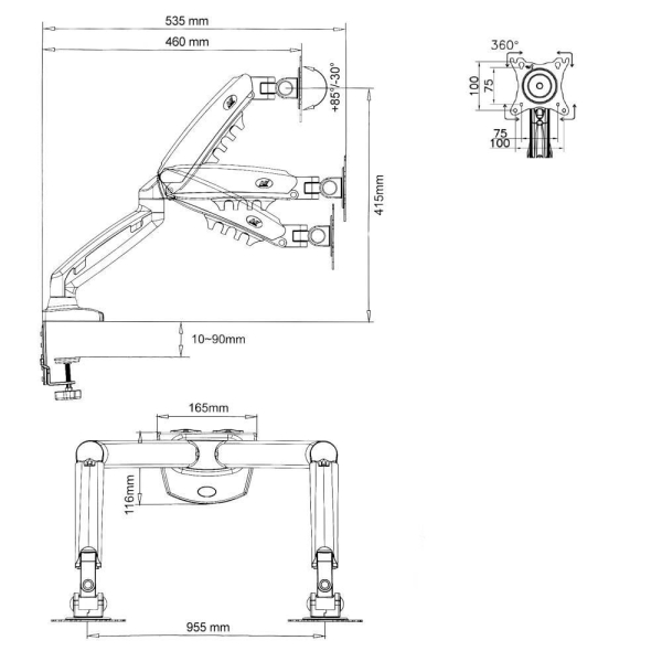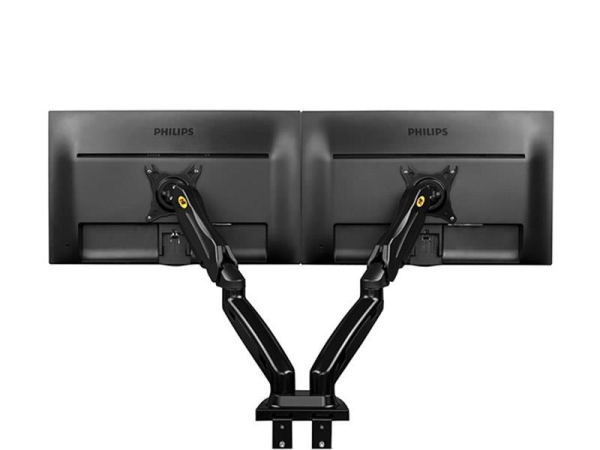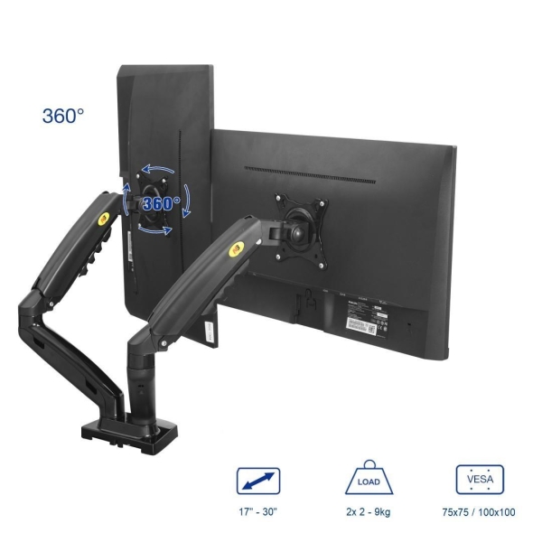Stolní držák na zavěšení 2 monitorů 17-30", nezávislé nastavení každého monitoru, výškové polohování 140-400mm, otáčení do stran +/-180°, naklápění +85°/-30°, vzdálenost od úchytu 0-530mm, pivot +/-360°, VESA 75x75 a 100x100, nosnost 18kg