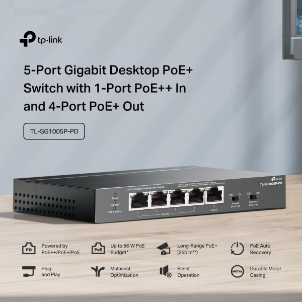 TP-LINK "5-Port Gigabit Desktop Switch with 1-Port PoE++ In and 4-Port PoE+ OutPORT: 4× Gigabit PoE+ Out Ports, 1× Giga
