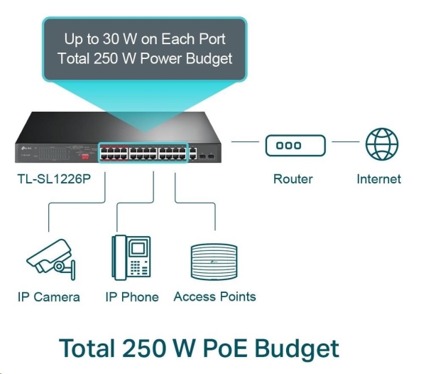 Vyhovuje standardu 802.3af/at PoE + a podporuje až 30 W napájení na každém PoE portu. Celkový výkon napájení až 250 W PoE pro 24× PoE porty, umožňuje široké spektrum aplikací, jako je dohled, kanceláře, koleje a malé podniky. Je plně kompatibilní s IP kamerami, přístupovými body, IP telefony, počítači, tiskárnami atd.
