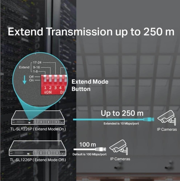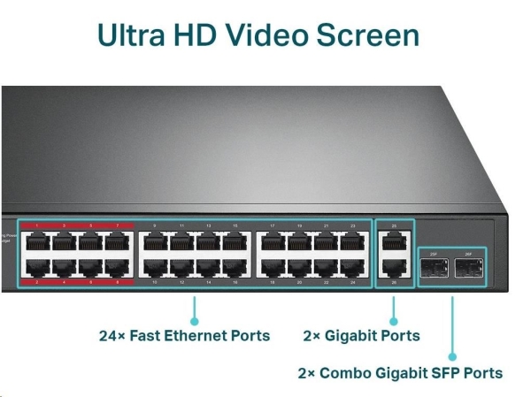 TP-Link CCTV switch TL-SL1226P (24x100Mb/s, 2xGbE/2xSFP combo, 24xPoE+, 250W)