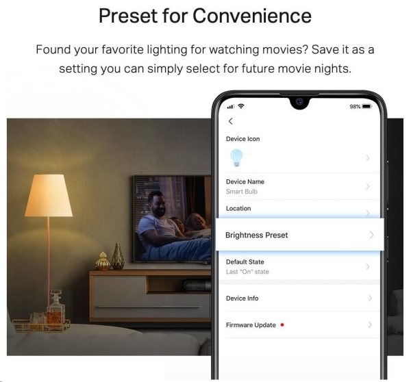 *Stmívatelná (snadno nastavitelná) - Mějte správu osvětlení vždy na dosah ruky a vytvořte si kdykoli v domácnosti dokonalou atmosféru *Stmívatelná (přednastaveno pro pohodlí) - Našli jste svůj oblíbený tón osvětlení pro sledování filmů? Uložte si jej pro budoucí filmové večery. *Rozvrh (nastavte si časy) - Vytvořte si pravidelný plán pro zapnutí/vypnutí osvětlení s přednastaveným jasem. *Rozvrh (režim východu/západu slunce) - Automaticky aktivuje světlo podle vašeho časového pásma. *Hlasové ovládání - Řiďte své osvětlení pomocí hlasových příkazů. Tapo spolupracuje s Amazon Alexa a Google assistant. *Vzdálená správa - Ovládejte osvětlení pomocí aplikace Tapo ve vašem telefonu. *Režim pryč - Automaticky simuluje, že je někdo doma, aby odstrašil nežádoucí návštěvníky. Obsah balení *Tapo L510E *Rychlá instalační příručka TECHNICKÁ SPECIFIKACE Komunikace *Protokol Wi-Fi: IEEE 802.11b/g/n *Frekvence Wi-Fi: 2.4 GHz Wi-Fi Všeobecné *Certifikace: CE, RoHS *Patice lampy: E27 Pracovní stav *Vstup: 20–240 V, 50/60 Hz, 73 mA *Typický světelný výstup: 806 lumenů *Příkon (skutečný příkon ve wattech): 8,7 W *Teplota barev: 2 700 K *Úhel paprsku: 220 stupňů *Stmívatelné: Ano