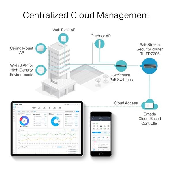 - Centralizovaná správa - Cloudový přístup a aplikace Omada pro maximální pohodlí a snadnou správu.