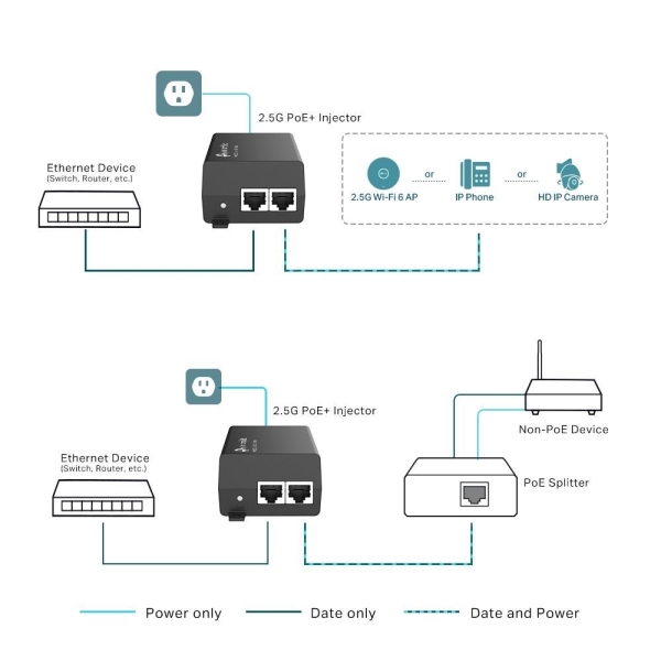 Injektor PoE+ POE260S plně vyhovuje standardu IEEE 802.3af/at a podporuje všechny adaptéry přijímače PD nebo PoE kompatibilní se standardem IEEE 802.3af/at PoE nebo jiné podobné produkty a rozšiřuje vaši síť tam, kde není elektrické vedení či zásuvka pro připojení zařízení, jako jsou 2,5 Gb/s přístupové body, IP kamery, IP telefony apod.