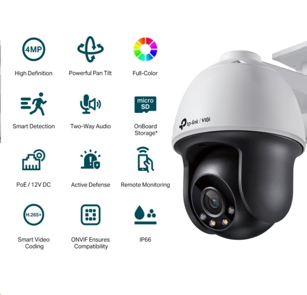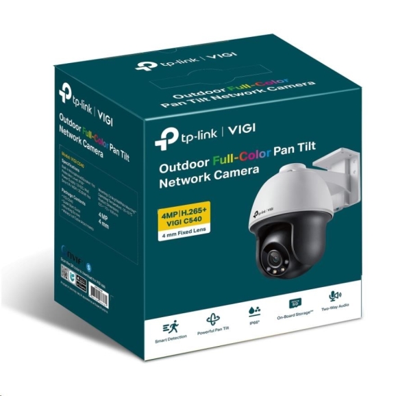 TP-Link VIGI C540 VIGI 4MP Outdoor Full-Color Pan Tilt Network Camera *4MP s vysokým rozlišením: Fotoaparát má rozlišení 4 MP - více než dost pixelů pro zachycení některých diskrétních detailů. *Plnobarevné 24 hodin denně: Získejte 24hodinové barevné detaily i v černočerné tmě díky vysoce citlivému snímači a přiloženým diodám LED. *Výkonné naklápění: Přizpůsobené trasy obchůzky a automatické sledování poskytují inteligentnější možnosti sledování klíčových oblastí a zvyšují bezpečnost ve vašem objektu. *Vodotěsnost: Spolehlivé krytí IP66 pro stabilní venkovní výkon. *Inteligentní detekce (detekce pohybu, narušení prostoru, překročení linie, narušení videa): Přijímejte oznámení a kontrolujte kanály, když někdo překročí hranici, vstoupí do nastavené oblasti nebo překáží kameře. *H.265+: Aniž by kamery využívaly jakoukoli další šířku pásma, přenášejí komprimované křišťálově čisté video, čímž šetří místo na disku, snižují zatížení sítě a náklady na monitorování bez ztráty kvality obrazu. *PoE/12V DC: Dva způsoby napájení vám poskytnou nejen větší pohodlí, ale také mimořádně usnadní zapojení. *Aplikace VIGI: Spravujte své zabezpečení jako na dlani. Zabezpečení: Password Protection, HTTPS Encryption, IP Address Filter, Digest Authentication Protokol: TCP/IP, UDP, ICMP, HTTP, HTTPS, DHCP, DNS, RTSP, NTP, UPnP UDP, SSL/TLS Senzor: 1/3” Progressive Scan CMOS Čočka: Fixed focal lens (2.8 mm / 4 mm / 6 mm) Pozorovací úhel: (4mm) Horizontal FOV: 79°Vertical FOV: 43°Diagonal FOV: 93° Noční vidění: IR Cut Filter IP: IP66 Rozlišení: 2560x1440, 2304x1296, 2048x1280, 1920x1080 Síťové rozhraní: 1 RJ45 10/100M Self-Adaptive Ethernet Port Audio: vestavený mikrofon a reproduktor Tlačítka: reset Slot: Micro SD card