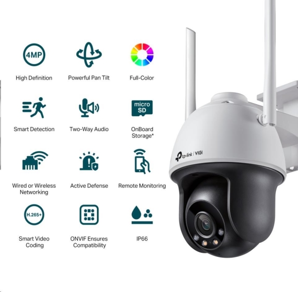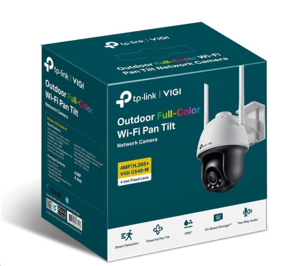 TP-Link VIGI C540-W VIGI 4MP Outdoor Full-Color Wi-Fi Pan Tilt Network Camera *4MP s vysokým rozlišením: Fotoaparát má rozlišení 4 MP - více než dost pixelů pro zachycení některých diskrétních detailů. *Plnobarevné 24 hodin denně: Získejte 24hodinové barevné detaily i v černočerné tmě díky vysoce citlivému snímači a přiloženým diodám LED. *Výkonné naklápění: Přizpůsobené trasy obchůzky a automatické sledování poskytují inteligentnější možnosti sledování klíčových oblastí a zvyšují bezpečnost ve vašem objektu. *Bezdrátové venkovní připojení: Jednoduché a rychlé nasazení díky signálům Wi-Fi. *Vodotěsnost: Spolehlivé krytí IP66 pro stabilní venkovní výkon. *Inteligentní detekce (detekce pohybu, narušení prostoru, překročení linie, narušení videa): Přijímejte oznámení a kontrolujte kanály, když někdo překročí hranici, vstoupí do nastavené oblasti nebo překáží kameře. *H.265+: Aniž by kamery využívaly jakoukoli další šířku pásma, přenášejí komprimované křišťálově čisté video, čímž šetří místo na disku, snižují zatížení sítě a náklady na monitorování bez ztráty kvality obrazu. *Aplikace VIGI: Spravujte své zabezpečení jako na dlani. Zabezpečení: Password Protection, HTTPS Encryption, IP Address Filter, Digest Authentication Protokol: TCP/IP, UDP, ICMP, HTTP, HTTPS, DHCP, DNS, RTSP, NTP, UPnP UDP, SSL/TLS Přenosová rychlost: 11 Mbps (802.11b) | 54 Mbps (802.11g) | 150 Mbps (802.11n) Zabezpečení: WPA/WPA2-PSK Senzor: 1/3” Progressive Scan CMOS Čočka: Fixed focal lens (4 mm) Pozorovací úhel: (4mm) Horizontal FOV: 79°Vertical FOV: 43°Diagonal FOV: 93° Noční vidění: IR Cut Filter IP: IP66 Rozlišení: 2560x1440, 2304x1296, 2048x1280, 1920x1080 Síťové rozhraní: 1 RJ45 10/100M Self-Adaptive Ethernet Port Audio: vestavený mikrofon a reproduktor Tlačítka: reset Slot: Micro SD card
