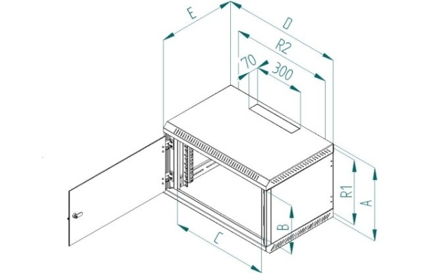 Přesné rozměry a další technické údaje jsou uvedeny níže (hodnoty R1 a R2 označují rozteče montážních otvorů pro zavěšení rozvaděče na zeď). Maximální zatížení rozvaděče je 30 kg.