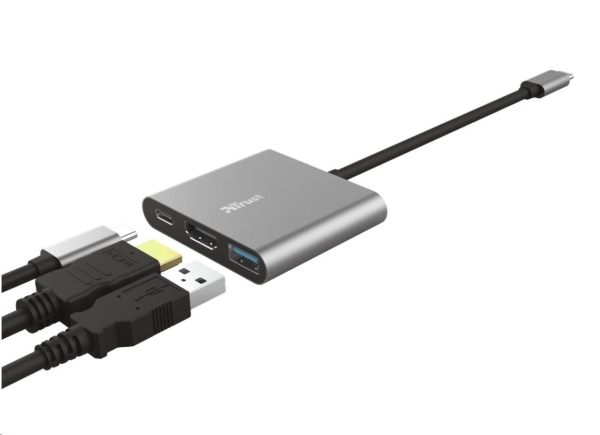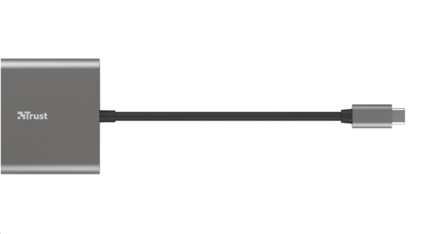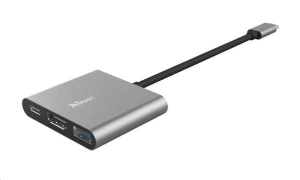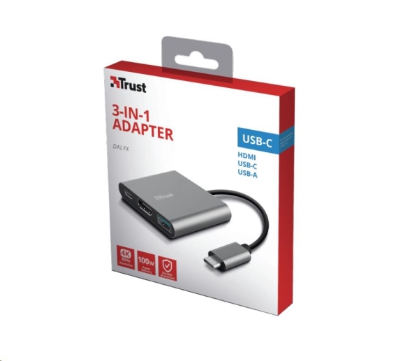 TRUST Dalyx 3-in-1 Multiport USB-C Adapter. Stylový hliníkový 3portový adaptér USB-C z hliníku pro přidání portů USB a HDMI a nabíjecího portu typu C do notebooku. Klíčové vlastnosti *Přidejte do svého notebooku další porty HDMI a USB a nabíjecí port USB-C pomocí jediného portu USB-C *HDMI port pro připojení monitoru nebo TV *Obrazy s vysokým rozlišením v bohatých barvách díky HDR a HDMI 1.4 (4K30Hz) *Port USB pro příslušenství, jako je klávesnice, myš a externí jednotka *Podporuje rychlost přenosu dat až 5 Gbps pomocí USB 3.2 Gen 1 *Port USB-C PD pro nabíjení notebooku s výkonem až 100 W *Odolné a stylové tlakové odlitky z hliníkové slitiny *Tenký a kompaktní, snadno přenosný při cestování Technické parametry *Délka hlavního kabelu: 10 cm *USB verze: 3.1 gen 2 *HDMI verze: 1.4 *Rozlišení: 4K 30Hz *Připojení pro: USB-C, HDMI, USB-A *Rozměry: 11 x 58 x 51 mm *Hmotnost: 38 g Odkaz na web výrobce: https://www.trust.com/en/product/23772-dalyx-3-in-1-multiport-usb-c-adapter