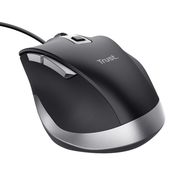 Trust Fyda drátová myš ECO Ergonomicky tvarovaná myš Trust Fyda je navržena pro celodenní pohodlné ovládání s vysokou přesností. Design Fydy spolu s opěrkou malíčku je uzpůsoben pro vaše pohodlí, takže můžete pracovat celý den, aniž byste se museli obávat únavy. Nedělejte si starosti s bateriemi. Kabelová myš Trust Fyda používá pro vaše pohodlí kabel USB. Zajišťuje stabilní připojení a funguje jen, když je připojena k počítači nebo notebooku. Technické parametry Rolovací kolečko: Ano Počet tlačítek: 6 Programovatelná tlačítka: Ne Rozhraní/konektivita: USB-A 2.0 Napájení: kabel USB, délka 150cm Nastavitelné DPI: Ano Rozlišení senzoru: 600, 1400, 2800, 5000dpi Snímač pohybu: optický Barva: černo-stříbrná Rozměry: 120x84x44mm Hmotnost: 90g Doporučené požadavky na systém: - volný port USB-A - Windows, macOS, Chrome OS Záruka: 2 roky
