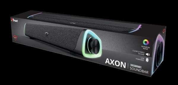 Trust GXT 620 AXON herní soundbar RGB s osvětlením duhovými vlnami a snadno přístupným ovládáním hlasitosti. Klíčové vlastnosti *Herní soundbar (12 W) pro upgrade vašeho herního zvuku *Tenký, prostorově úsporný design se snadno vejde pod monitor TV nebo PC *RGB osvětlení duhové vlny, které odpovídá vašemu nastavení *Provádějte rychlé úpravy hlasitosti při hraní s velkým ovládacím kolečkem *Přehrávejte hudbu ze zařízení s analogovým (3,5 mm) vstupem Technické parametry *Typ reproduktoru: Soundbar *Speciální funkce: RGB *Typ připojení: kabelové *Výstupní výkon (špička): 12 W *Výstupní výkon (RMS): 6 W *Frekvenční odezva: 20 Hz - 20 000 Hz *Impedance reproduktoru: 4 ohmy *Vstupní impedance: 10 000 ohmů *Zvukový vstup: 3,5 mm *Rozměry: 68 x 420 x 78 mm *Celková hmotnost: 713 g Odkaz na web výrobce: https://www.trust.com/en/product/24482-gxt-620-axon-rgb-illuminated-soundbar