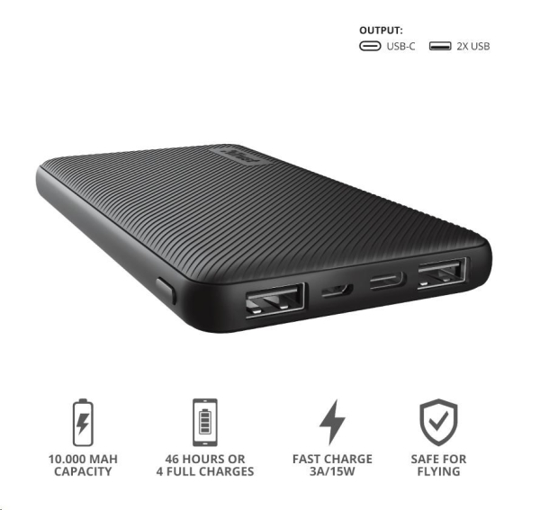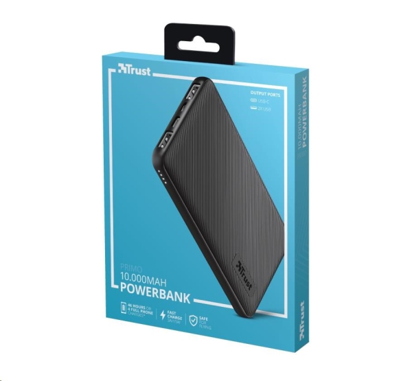 Ultratenká powerbanka pro rychlé nabíjení na cestách (10 000 mAh) Nabíjejte současně tři telefony nebo tablety – od jakékoli značky – přes 2 porty USB-A a 1 port USB-C, takže budete vždy připojeni a připraveni pracovat (nebo hrát). Nabijte samotnou powerbanku pomocí přiloženého micro-USB kabelu nebo USB-C portu. Ultratenký a kompaktní design vám umožní zabalit, dobít a jít – aniž byste museli při každodenním nošení zvyšovat váhu nebo objem, zatímco funkce rychlého nabíjení nabíjí vaše zařízení maximální rychlostí. *Počet portů USB: 3 *Ukazatele: Úroveň baterie *Svítilna: Ne *Příslušenství: USB-C nabíjecí kabel Baterie *Lithium-iontový polymer *Kapacita baterie (mAh): 10 000 mAh *Napětí baterie (Volt): 3,7 V *Doba nabíjení: 6 hodin https://www.trust.com/en/product/24678-primo-ultra-thin-powerbank-10-000-mah-eco