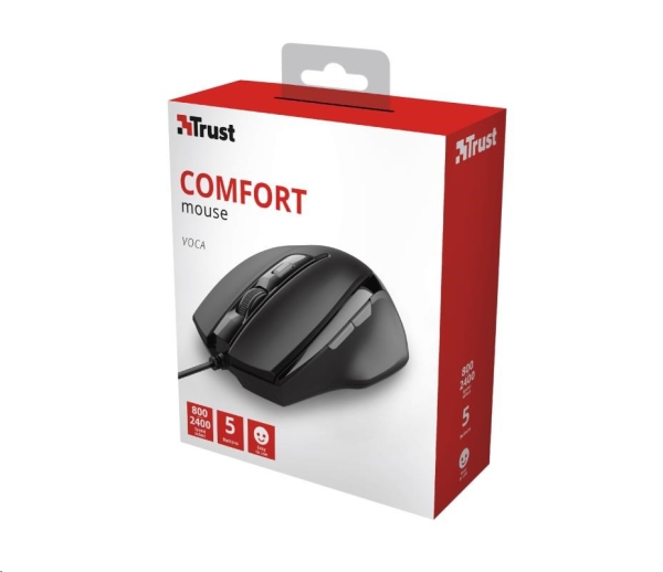 TRUST Voca Comfort Mouse. Snadno použitelná myš s pohodlným tvarem. Klíčové vlastnosti *Kabelová myš s pohodlným tvarem pro snadnou práci *Vyberte si svou oblíbenou rychlost od 800/1200/1600/2400 DPI *Snadné nastavení: stačí zapojit konektor USB a můžete začít *2 palcová tlačítka: prohlížeč zpět a další *Pohodlný tvar pro uvolněné uchopení *Délka kabelu 160 cm Technické parametry *Typ připojení: kabelové *Délka hlavního kabelu: 160 cm *USB verze: 2.0 *Typ konektoru: USB *Rozsah DPI: 800 dpi - 2400 dpi *Senzorová technologie: optická Odkaz na web výrobce: https://www.trust.com/en/product/23650-voca-comfort-mouse
