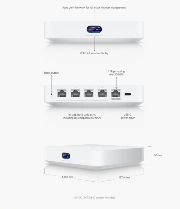 Pomocí integrované aplikace UniFi Network dokážete spravovat až 30+ UniFi zařízení a obsloužit až 300+ připojených klientských zařízení. Nechybí stavový displej o velikosti 0,96". Napájení je řešeno prostřednictvím USB-C konektoru, napájecí adaptér je součástí balení.