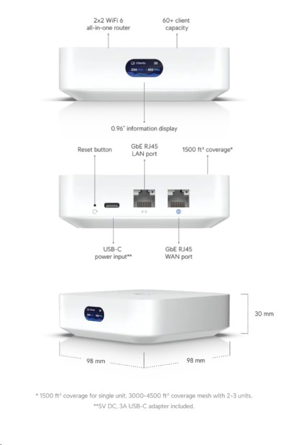 UniFi Express je výkonná a kompaktní UniFi Cloud Gateway s WiFi 6 access pointem. K dispozici je 1x WAN port a 1x LAN port k rozšíření sítě. Router je vybaven LCM displejem pro zobrazení různých informací, například rychlosti stahování a nahrávání. Podporuje VPN, kterou lze jednoduše nastavit přes webové rozhraní. Zařízení je napájeno pomocí USB-C.