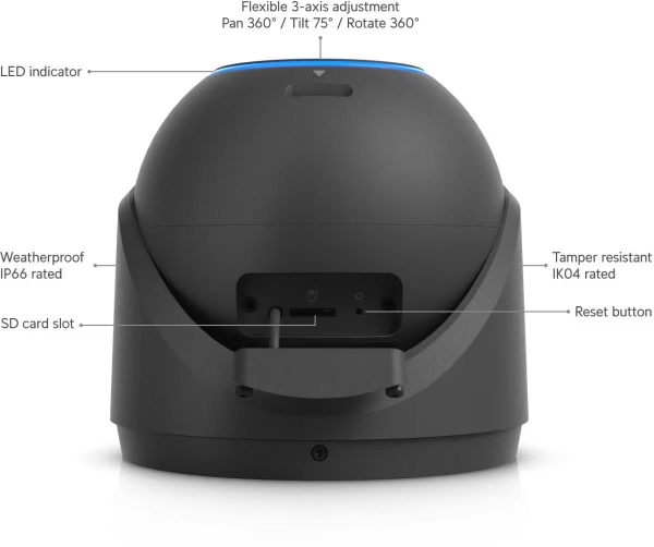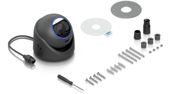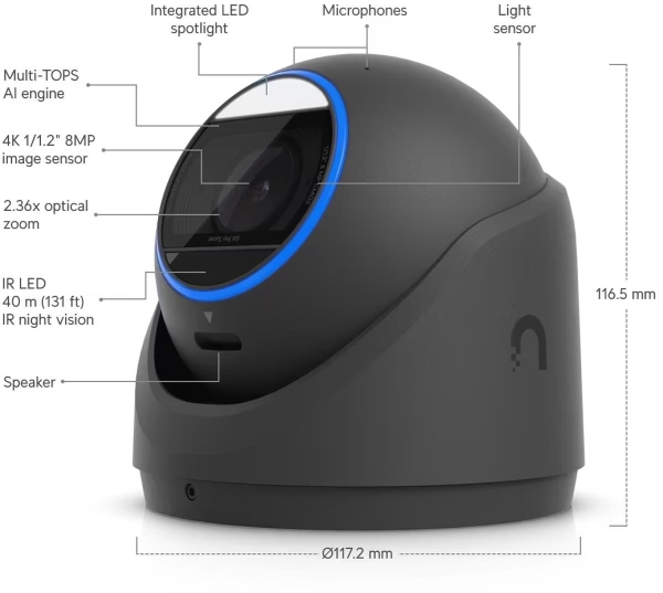 Ubiquiti UniFi IP turret hybrid kamera UVC-G6-Pro-Turret-W disponuje 8MP snímačem (3840 x 2160 px) při 30fps, variofokálním objektivem (5,85mm-13,8mm), kombinovaným IR/bílé světlo přísvitem pro noční vidění na vzdálenost až 40m, krytím IP66 a IK4 a vestavěnými mikrofony. Do sítě lze kameru připojit pomocí 1Gbit LAN s podporou napájení přes PoE+ s maximální spotřebou 15W.