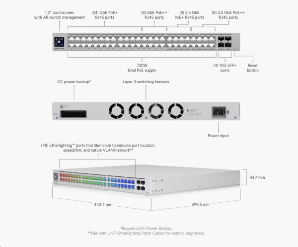 Ubiquiti USW-Pro-Max-48-PoE je 48 portový PoE switch s podporou L3 funkcí. Switch nabízí 16x 2.5Gb porty, z nichž 8 podporuje PoE 802.3af/at/bt až 60W na port a dalších 8 podporuje 802.3af/at až 30W na port. Dále jsou zde 32x 1Gb porty, z nichž 8 podporuje PoE 802.3af/at/bt až 60W na port a zbývajících 24 má podporu PoE 802.3af/at až 30W na port. Celkový PoE budget switche je 720W. Switch je také vybaven 4x SFP+ porty a je připraven i pro redundatní napájení pomocí Ubiquiti UniFi SmartPower Redundant Power System (USP-RPS).