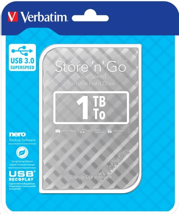 VERBATIM HDD 2.5" 1TB prenosný pevný disk Store 'n' Go USB 3.0, strieborná Špeciálne funkcie: Dostupné farby: čierna, strieborná, biela, červená a modrá Dostupné kapacity: 500 GB, 1 TB a 2 TB Vysokorýchlostné úložisko s vysokou kapacitou. Rýchle a bezpečné riešenie na rozšírenie úložiska alebo zálohovanie súborov USB 3.0 SuperSpeed - pre veľmi rýchly prenos dát Nero Backup Software Softvér na úsporu energie USB REC & PLAY* - podporuje nahrávanie/prehrávanie cez USB 2 roky obmedzená záruka** Systémové požiadavky: PC alebo Mac s USB 3.0 Windows XP / Vista / Windows 7 a 8 Mac OS X 10.4 alebo vyššia Obsah balenia: Prenosný pevný disk / USB 3.0 Kábel / Nero Backup Software / Green Button Energy Saving Software / Verbatim Formatter / Quick Start Guide / User Guide (predinštalovaný na disku).