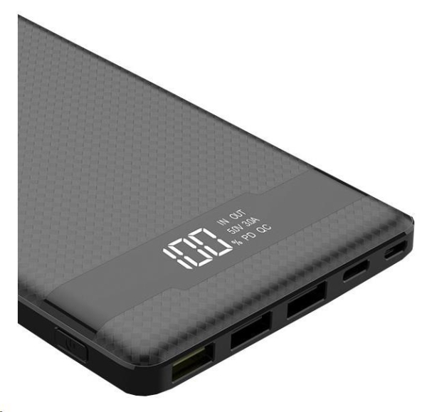 3x vstupní konektory Vám zajistí nabíjení powerbany jakýmkoliv kabelem. Powerbanka podporuje vlastní rychlonabíjení přes USB-C a micro USB a to az 12V!. K nabíjení slouží i Apple Lightning konektor