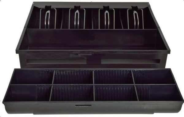 * Výměnný pořadač se 4 kovovými držáky bankovek * Vyjímatelný mincovník s 8 zásobníky mincí * Otvírání zásuvky: mechanicky klíčkem nebo elektronicky * Elektronická kontrola otevření zásuvky (tzv. microswitch) * Mechanicky odolná konstrukce * K dispozici jako další příslušenství náhradní pořadač a kovový uzamykatelný krytSpecifikace