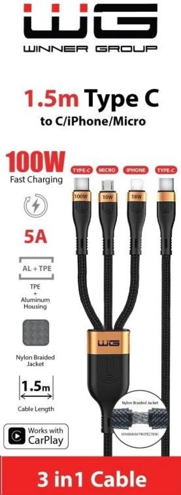 WG - Datový kabel 3v1 Type-C na Type-C na Lightning na Micro USB, 1,5 metrů, 5A, 100W, černá