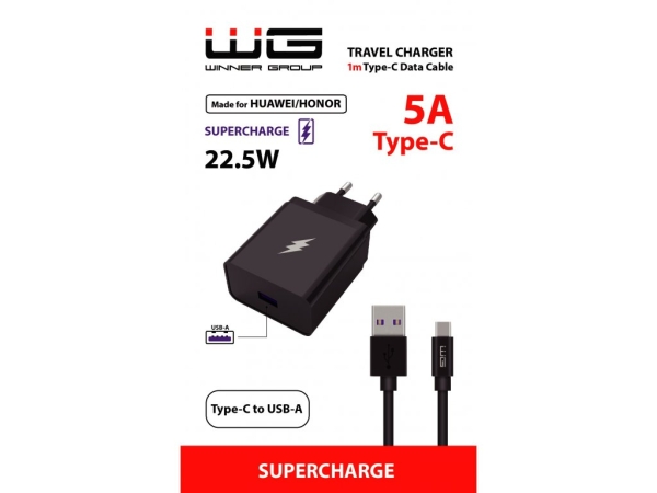 WG - Síťová nabíječka 1x USB-A 22,5W, SuperCharge, 5V-9V-12V, + kabel USB-A na Type-C (5A), černá