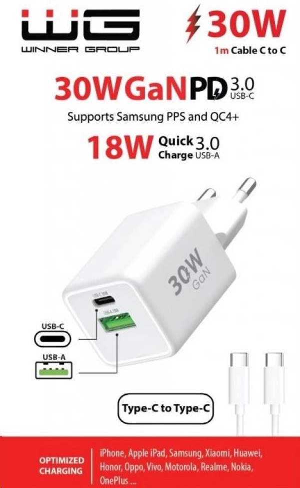 WG - Síťová nabíječka GaN 2x USB 30W, 1x USB-C PD3.0 PPS QC4 30W + USB-A 18W, kabel Type-C na Type-C, bílá